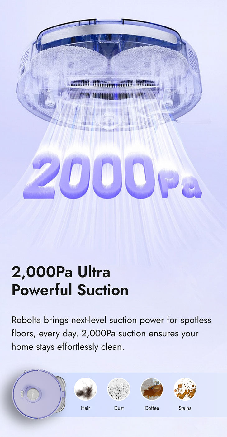 | Performance & Power: | 2,000Pa suction, 4-level adjustable speed (600Pa to 2,000Pa) |